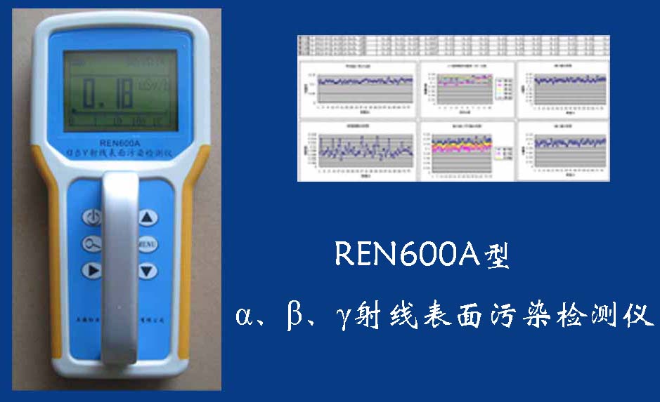 REN600A型α、β、γ射線表面污染檢測儀即可檢測α、β、γ射線,也能檢測到X射線,它采用高速嵌入式微處器作為數(shù)據(jù)處理單元,點陣式大屏幕LCD液晶顯示,讀數(shù)清晰、操作方便,具有400條超大容量數(shù)據(jù)存儲。儀器采用進口的大面積MICA蓋革探測器,具有較高探測效率,可進行α、β輻射表面污染檢測和X、γ輻射劑量率的監(jiān)測。此外通過配套的RenriCont表面污染管理軟件可將存儲的數(shù)據(jù)讀出后分析?蓮V泛用在制藥廠、實驗室、發(fā)電廠、進出口商檢、采石場、環(huán)境實驗室、環(huán)境污染調(diào)查、核安全應(yīng)急、緊急狀況營救站、金屬處理廠、地下油田、供油管道裝備、醫(yī)院核醫(yī)學科、同位素實驗室、環(huán)境保護和警察局等部門。REN600A型α、β、γ射線表面